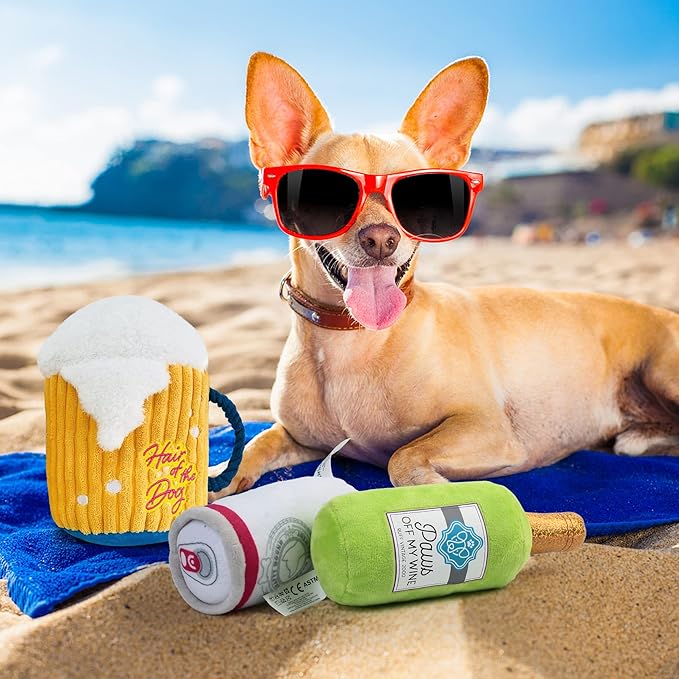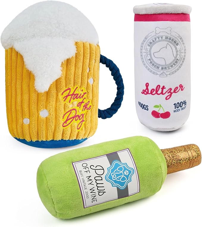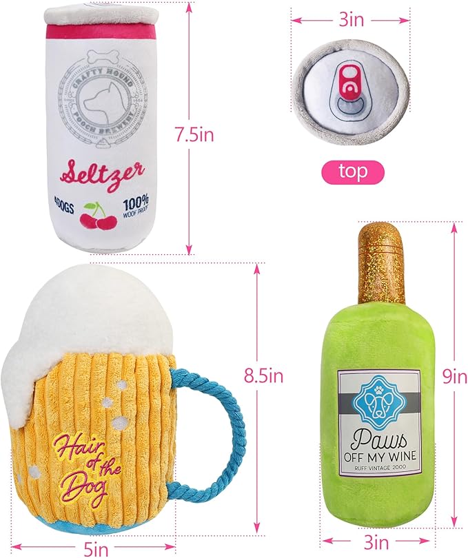 - Dog Toys Bundle: Our dog toy set include a stuffed mug, a crinkle wine bottle and a squeaky beer can; Realistic dog toys provide hours of chewing and playing fun while keeping your dog busy; Note: Not suitable for aggressive chewers and are not indestructible