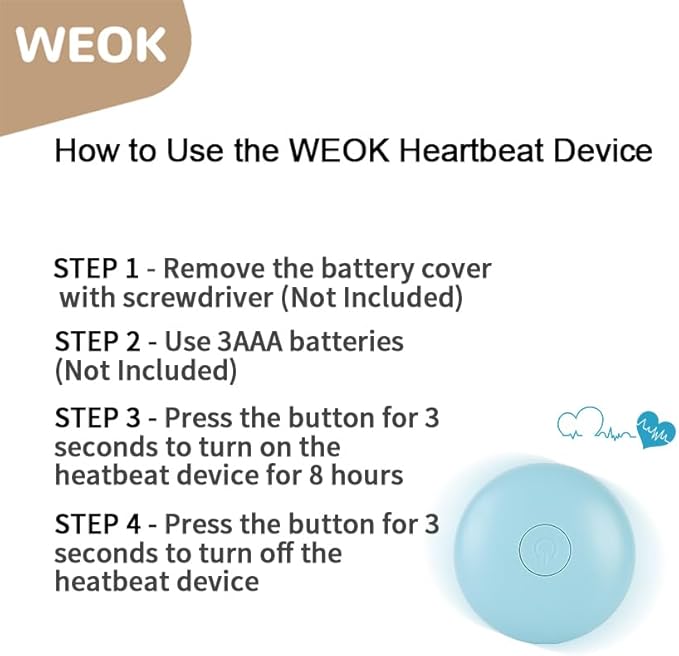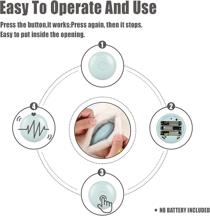 - Our Service: we hope to provides the best company and comfort to puppies, cats. If you have any question, please do not hesitate to contact us. We will feedback to you ASAP. Important tips for heartbeat device : Press and hold the switch long enough,it works; Press and hold the switch long enough,it stops.
