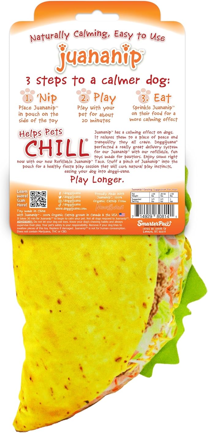Doggijuana Refillable Juananip Toy Bundle | Taco Bundle | Funny Dog Toy Plush with Catnip and Refill | Calming Aid for Dogs | Interactive Chew Toy for Play