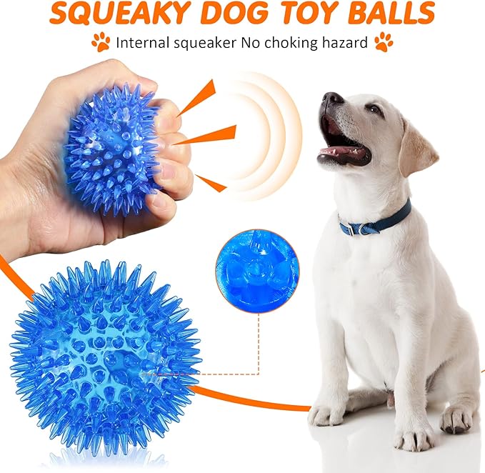- Teething and Training: spiky texture on the squeaky dog toys can help dogs to improve teeth health through chewing; Designed with an inner squeak, the dog teething toys can make dogs love chewing and playing