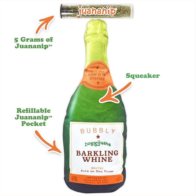 - REFILLABLE FUNNY DOG TOY - The Doggijuana refillable toy and catnip bundle includes a plush, refillable dog toy and a bottle of organic Juananip—catnip made safe for dogs. Insert a pinch into the built-in pocket to create a fun, scented dog toy that encourages natural play behaviors. Great for dogs who enjoy chewing, fetching, or snuggling with interactive plush toys. Our catnip is hand harvested in North America and will have your furry fan chewing, chilling, and easing into doggi-vana.