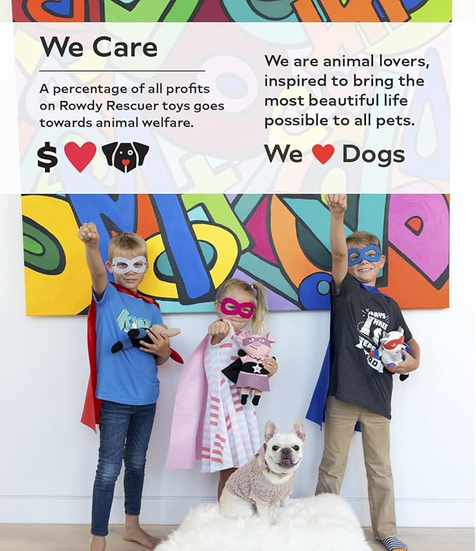 - DELUXE SQUEAKERS WITH SUPERPOWERS: Strong, loud, quality squeakers are included for hours of rowdy fun! Safe for machine washing after playtime. These toys symbolize the mission of animal advocates who strive to protect the innocent and give a voice to the voiceless.