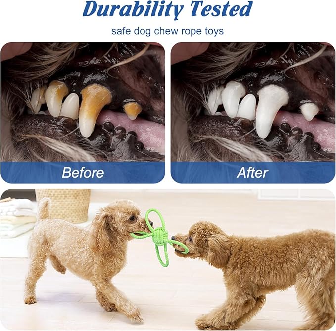 - ✔High-quality Material for Dog's teeth and health: Non-toxic and tasteless natural cotton rope toys can safely protect and clean the teeth of dogs. The cotton rope knot is a wear-resistant, tightly woven twist. And sturdy knots make puppy teething toy stand up for aggressive chewing. It won’t hurt the dog’s teeth or gums.