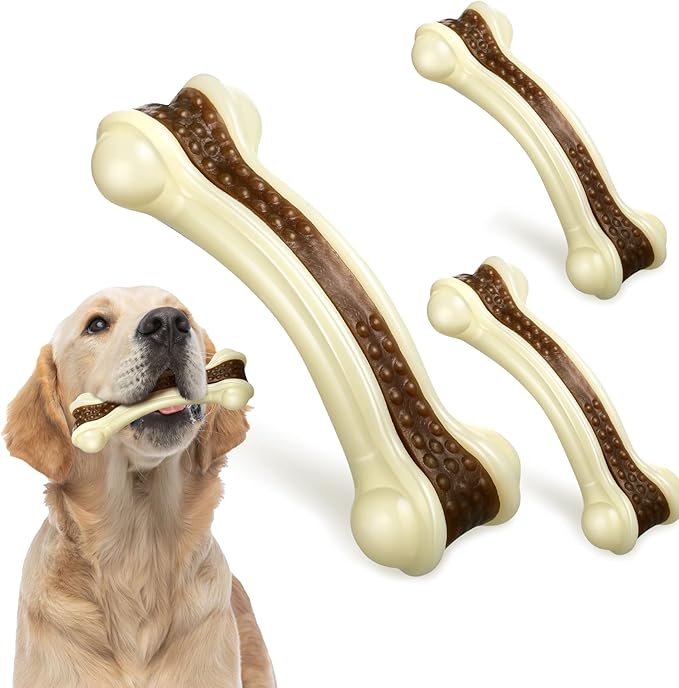 Sosation 3 Pack Chew Toys for Aggressive Chewers, Bone Toys Nylon Beef Flavor Dog Teething Toys for Large/Medium/Small Puppies Breeds(Large, Medium, Curved Bone)