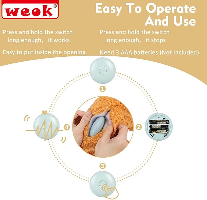- 【Heartbeat Simulator Module + Plush Toy】The WEOK product contain a plush dog toy and a heartbeat simulator Module. The heartbeat Simulator need 3 AAA batteries(No battery included in the package). Press the button, then the heartbeat module works. Easy to operate.