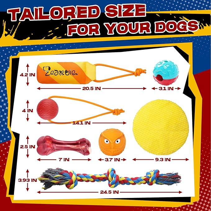 - Reliable Materials:Tough rope toy in strong cotton; squeaky tug toy in durable oxford-cloth; treat ball made of sturdy natural rubber; bone chew toy in tough nylon; tug ball toy of firm, bite-resistant natural material. Safe and durable for healthy fun