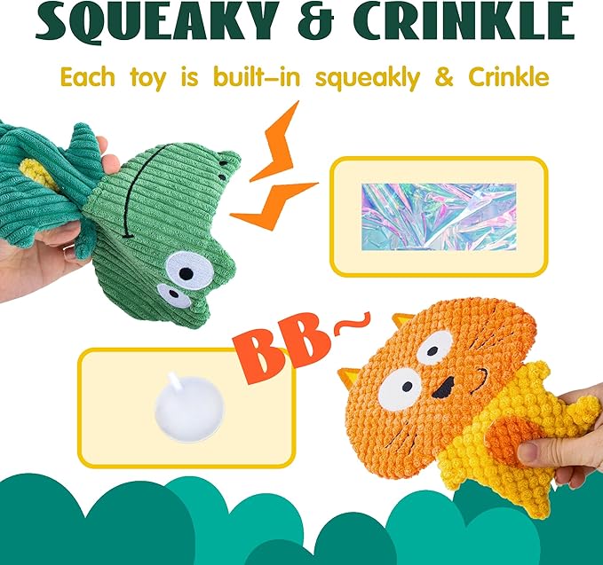 - 【Crinkle & Squeaky Dog Toys】When your dog bites or presses the soft dog toy, the built-in squeaker could make a sound. This sound will stimulate the dog's curiosity, and your dog will always explore it. Besides, there is hard-to-resist crinkle paper. It adds an extra level of sensory stimulation for your dog, providing a fun and engaging playtime experience. Attract your dog's attention and keep it busy all day long. These funny dog toys are always your dog's friend!