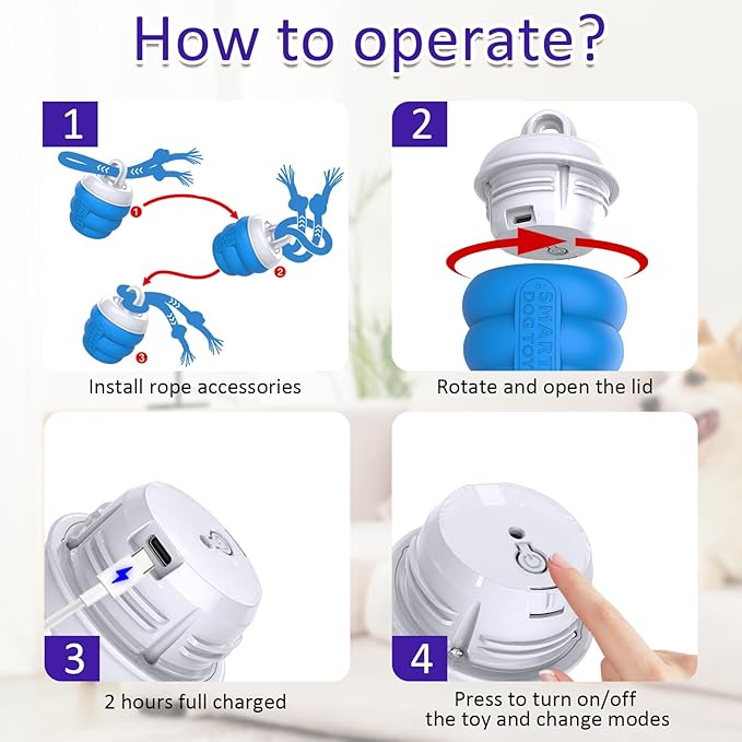 - How to use? Screw out the outer case to see the power button. Press first, power on and dog ball rolls in fast mode(blue light), change working mode by short press. Slow mode(purple light),Interactive mode(yellow light).Add the stronger rope on help balls rolls well, or you could DIY others special tails