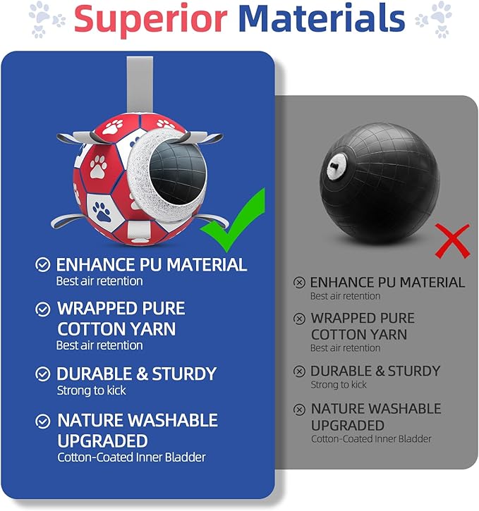 - Dog Soccer Ball with Straps:9 straps and the hexagon texture on the outside that make it easy for dogs to pick up and retrieve during playtime or training. The design of the nylon strap causes the premium pet toys to bounce irregularly when it touches the ground, stimulating the dog's hunting instinct.