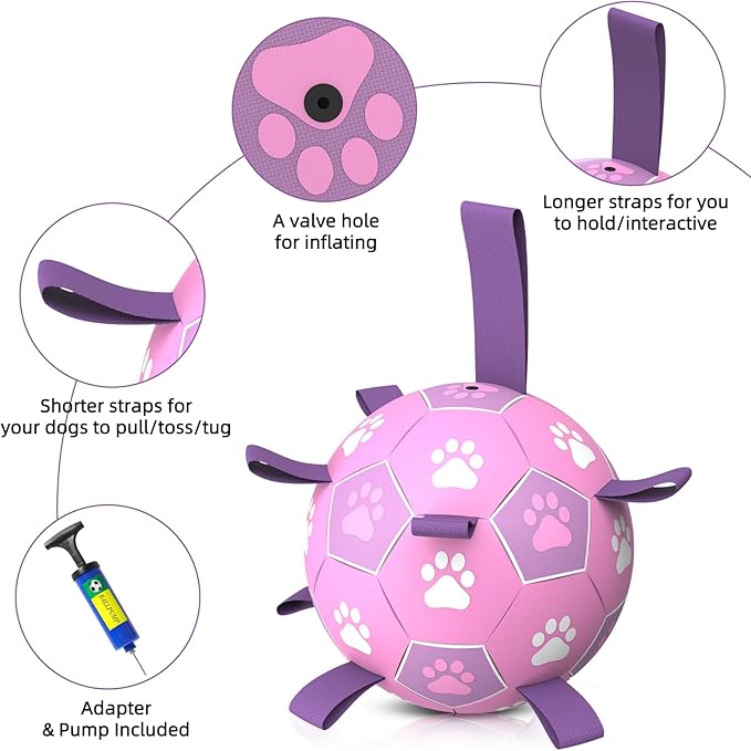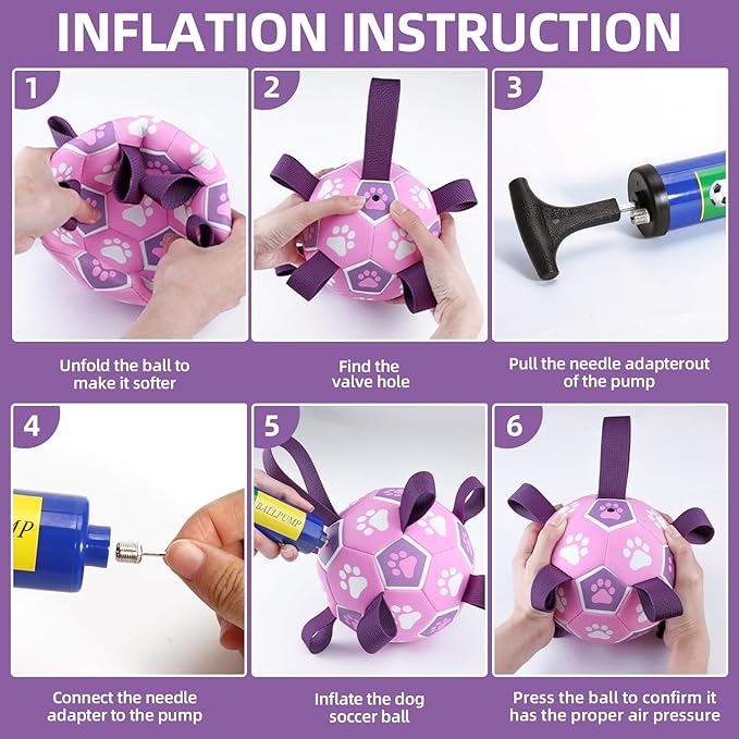 - ⚽Pump & Needle Adapter Included: The herding balls for dogs comes deflated. There's a a needle point adapter and a pump inside as well while other items in the same market only include a ball needle. The soccer ball dog toy is 8 inches in diameter, perfect for large breeds, not for aggressive chewers.