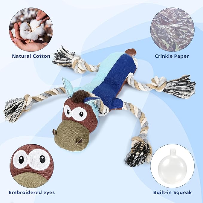 - 【Unique Design】The dog chewy toys are designed in the shape of a donkey, perfect for puppies,small,medium and large dogs. The eyes nose and mouth of the stuffed dog toys are hand embroidered. Compared with other craft, embroidery makes the toy more vivid and extremely long lasting.Besides,IOKHEIRA dog toys are machine washable , not fade or be out of shape.