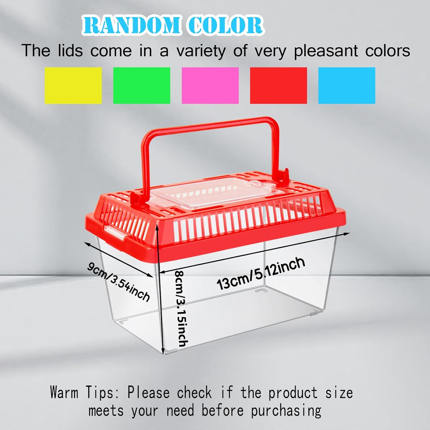 12Pcs Plastic Reptile Terrariums Carrier Cage Tarantula Enclosure Snake Breeding Box Hatching Container Transparent Fish Tank Turtle Aquarium with Random Color Lid for Spider, XS(5.1” x 3.5” x 3.5”