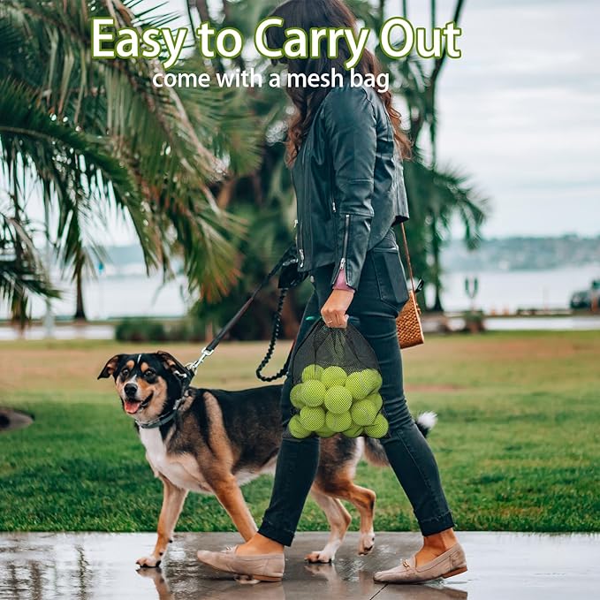 - 【WHAT YOU WILL GET】The package includes 20 pack 2.5-inch dog tennis balls, along with a reusable mesh bag featuring a sliding drawstring cord lock closure. This makes it easy to carry and retrieve the balls.