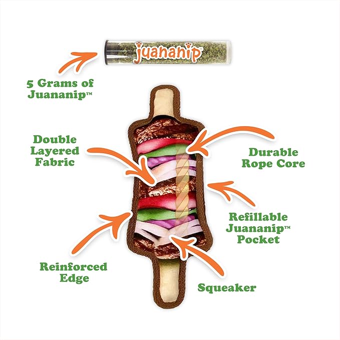 - DURABLE CHEW TOY FOR DOGS - Designed with double-layered fabric and a rope-reinforced core, this toy is great for dogs who love to chew and tug. This funny plush dog toy is designed to captivate your dog’s attention with scent-based stimulation. Adding Juananip transforms the toy into an engaging sensory experience that encourages extended play and enrichment. Ideal for interactive sessions and supervised play that helps burn energy and reduce boredom.