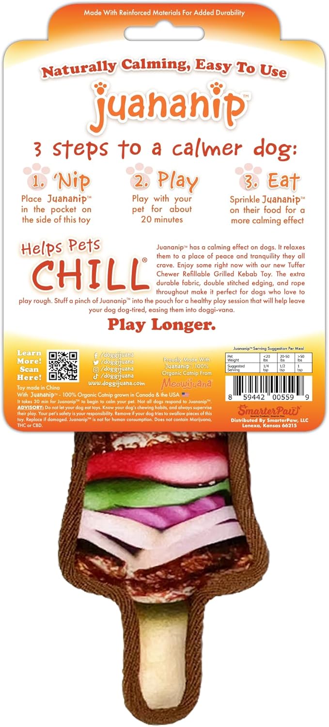 - REFILLABLE FUNNY DOG TOY - The Doggijuana Tuffer chewer toys include a durable, squeaking, refillable dog toy and a bottle of organic Juananip—catnip made safe for dogs. Insert a pinch into the built-in pocket to create a fun, scented dog toy that encourages natural play behaviors. Great for dogs who enjoy chewing, fetching, or snuggling with interactive plush toys. Our catnip is hand harvested in North America and will have your furry fan chewing, chilling, and easing into doggi-vana.