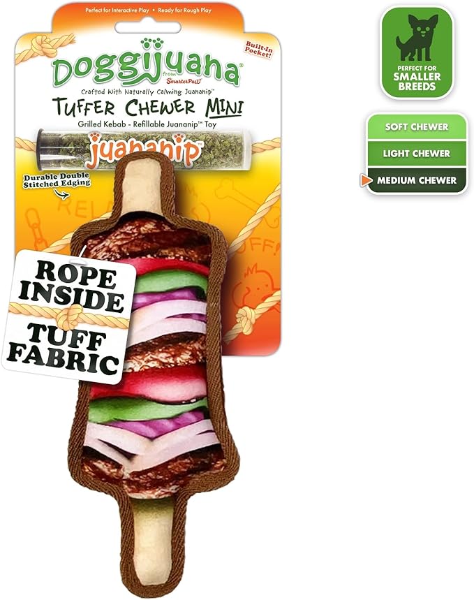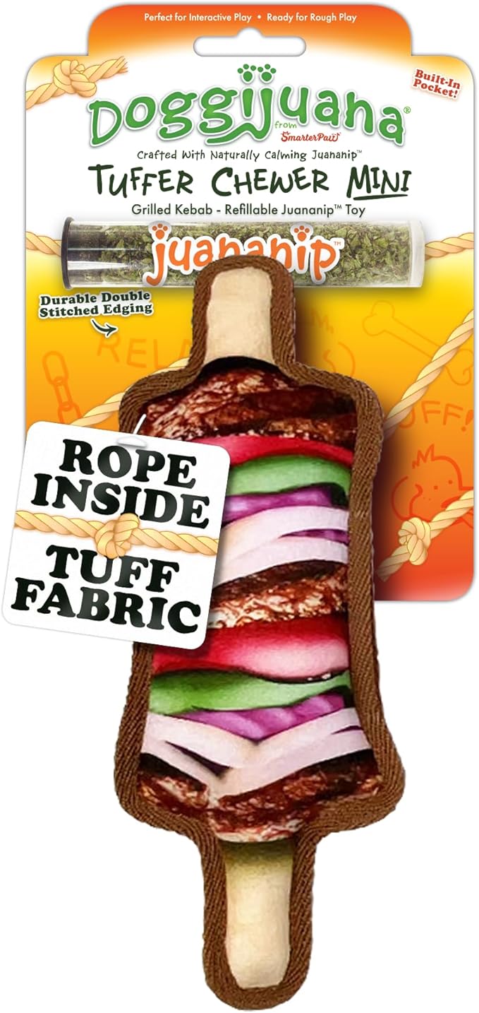 Doggijuana Tuffer Chewer Mini Plush Dog Toy | Funny Dog Toy Plush with Juananip Catnip for Dogs | Calming Aid for Dogs | Interactive Squeaky Chew Toy for Play (Kebab)