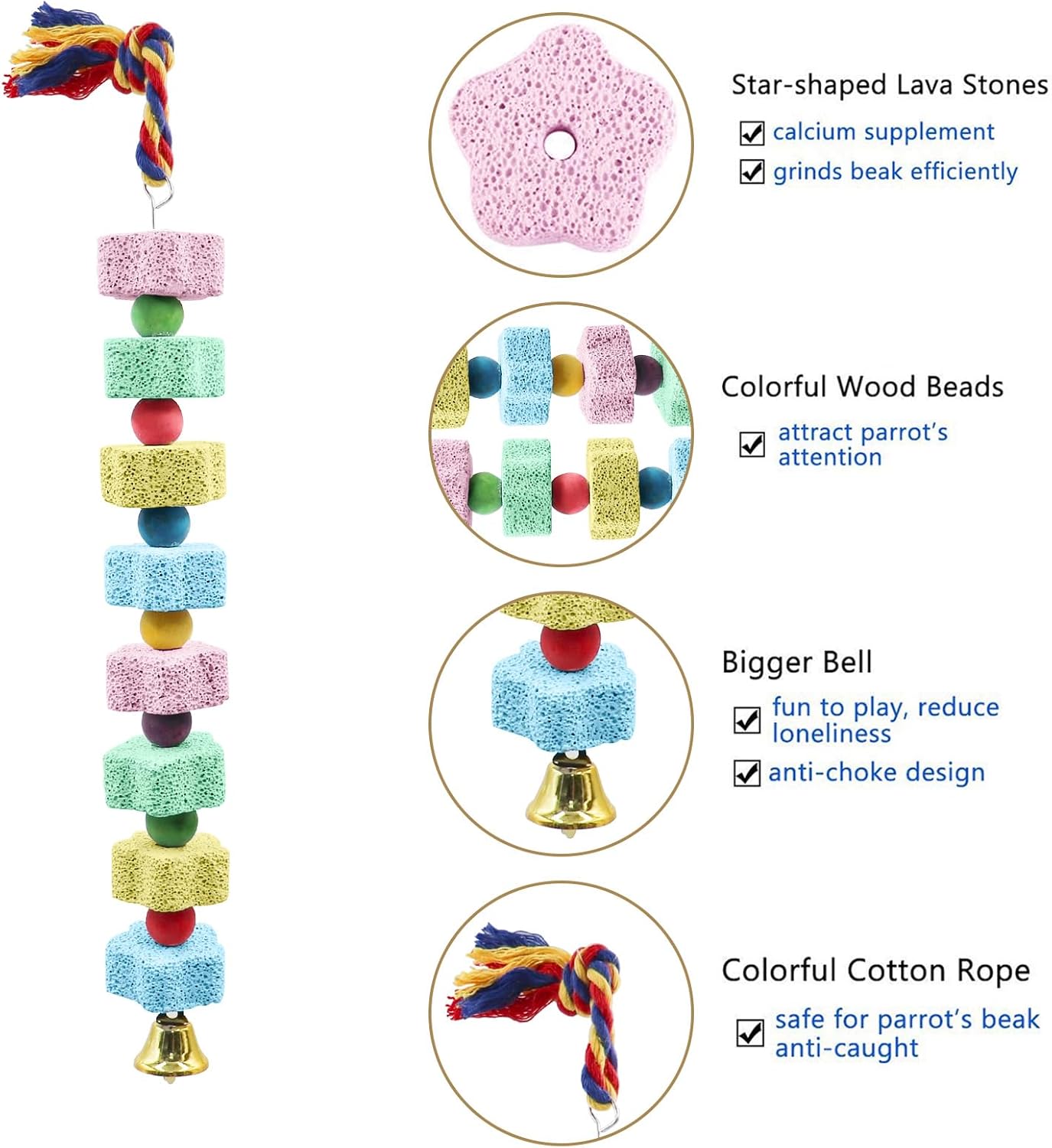 - Perfect Design: The colorful parakeet stone toy is polished into a star shape, which is both beautiful and more convenient for parrots to chew. The transition between the grinding stones is made by colorful beads, which can attract the attention of parrots on the one hand, and decorate your pet's cage on the other. There is a bell at the bottom of the bird's chew toy, which will emit a pleasant ringing sound when the bird pecks.