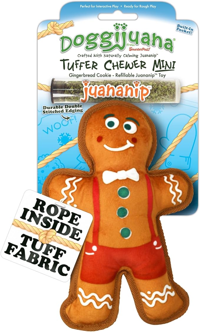 Doggijuana Tuffer Chewer Mini Plush Dog Toy | Funny Dog Toy Plush with Juananip Catnip for Dogs | Calming Aid for Dogs | Interactive Squeaky Chew Toy for Play (Gingerbread Cookie)