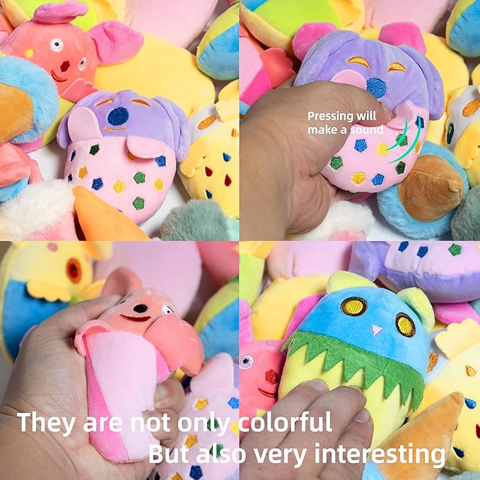 - 【Diverse Designs】20 pack small dog toys with soft stuffed squeaky toys ,include:14pcs colorful and diverse oval animals designs and 6pcs cute ice cream designs.