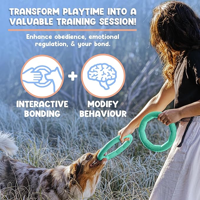 - Training aid & behaviour modification: Turn playtime into a valuable training session with our Active Rings. Our Active Rings can be used as a tool to reinforce commands, transforming routine obedience training into an enjoyable bonding experience for you and your furry friend. They can also be used to teach larger, deeper concepts such as cooperation, trust, impulse control, emotional regulation, motivation, agreement, and authority. All of these skills are incredibly useful for anxious or reactive dogs, building engagement in their handler and building positive associations with certain triggers or environments.