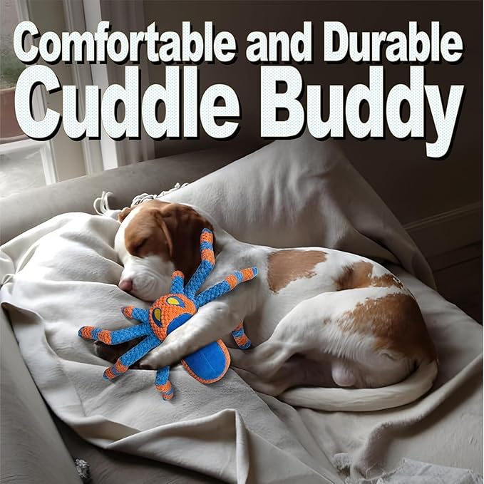 - Funny Dog Chew Toy: Cute angry spider,Vibrant blue dog toys. This super fun large dog toy has a squeaker in the head and crinkly paper in legs. Squeak and crinkle offer a delightfully sounds treat. The highly elastic tentacles offers maximum tug of war pleasure, while the sound attraction and dynamic changes will keep your pet engaged for hours. The squeaky dog toy is the ultimate toy for your furry friend and no dog can resist it