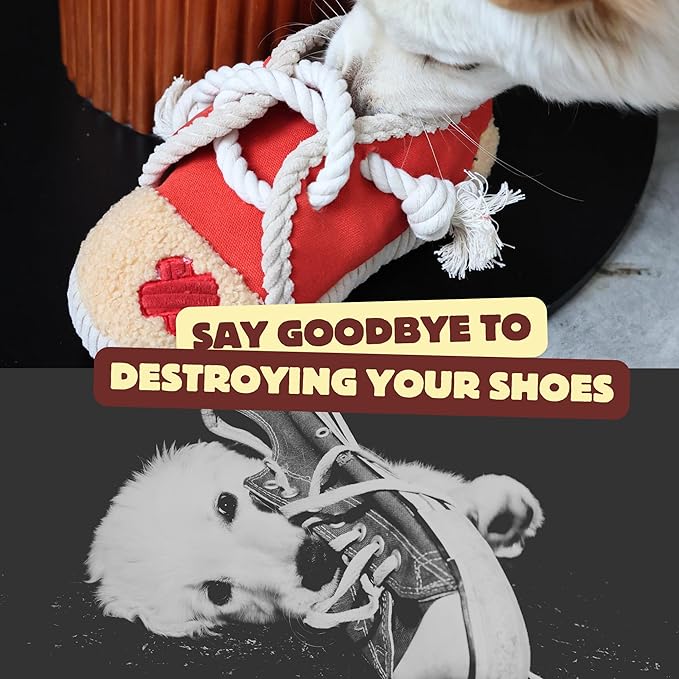 - 👟 The Perfect Shoe Alternative for Chewers – Does your dog have a habit of chewing your shoes? Our dog shoe chew toy provides a realistic shoe shape to redirect destructive chewing to a fun and safe alternative, protecting your sneakers, sandals, and furniture from damage.