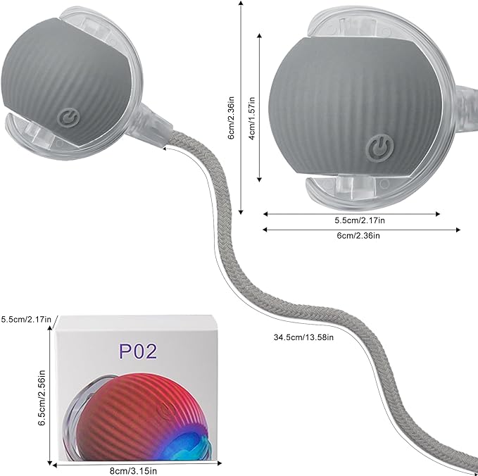 - Material and size: The surface of the hunting toy ball is made of silicone for a comfortable touch, don't worry about your cat's paws scratching. The diameter of the ball is about 2.3 inches and the length of the rope at the end is 13 inches, with a slight elasticity that makes cats think it's a flexible smart mouse and get interested in chasing and hunting. This indoor automatic light rolling toys balls not only for large and small dog and cats but also for other playful and active pet.