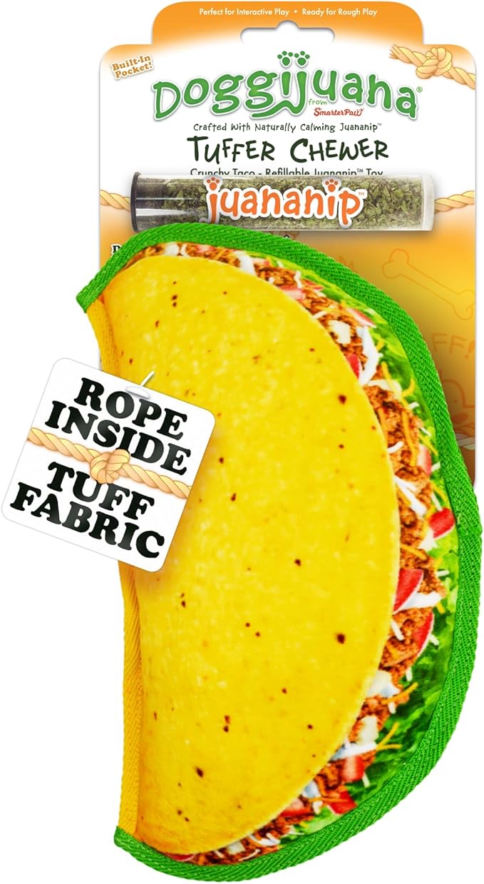 Doggijuana Tuffer Chewer Plush Dog Toy | Funny Dog Toy Plush with Juananip Catnip for Dogs | Calming Aid for Dogs | Interactive Squeaky Chew Toy for Play (Taco)