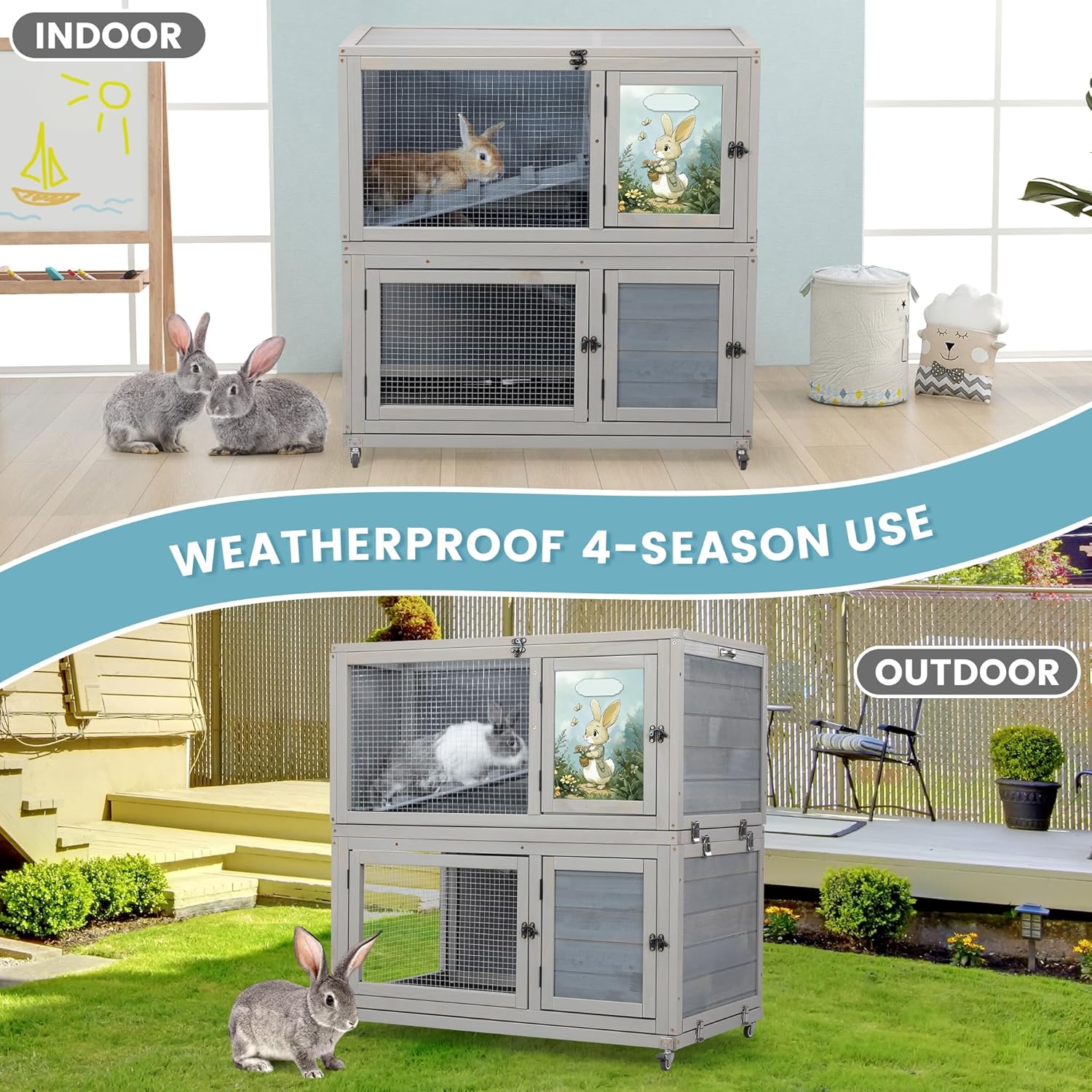 2-Story Wooden Rabbit Hutch for Outdoor & Indoor, Bunny Cage Rabbit House with Wheels, Trays, Ramp, Pet Home for Guinea Pigs, Chickens, Chicken Coop, Gray with Colorful Patterns