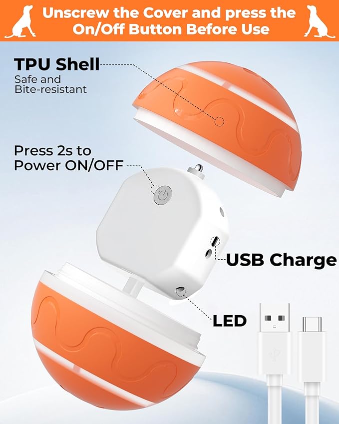 - 【USB Rechargeable】 The smart jumping ball for dogs has a built-in 500mAh battery, equipped with a charging cable for easy charging, it takes about 2 hours to fully charge, after a simple charge the electric dog ball toy can provide 1 to 4 hours of interaction time