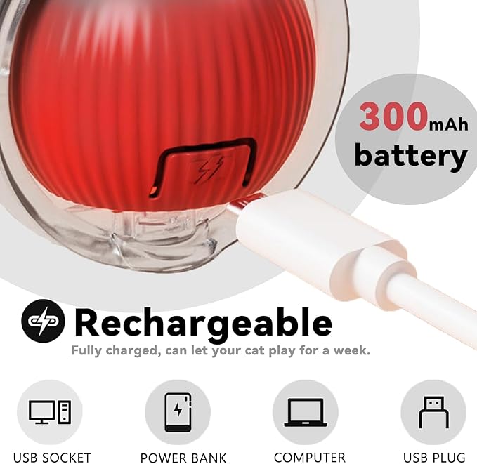 - 3 Modes and Introduction: The electric cat ball has fast mode (blue light), slow mode (purple light), and interactive mode (yellow light); by default, the speaker is turned on when it is turned on. Press twice to turn off the speaker (the red light flashes twice), and press twice to turn it on (the green light flashes); Low voltage indication: the red light flashes quickly before shutting down. When charging, the red light flashes, and when fully charged, the red light remains on