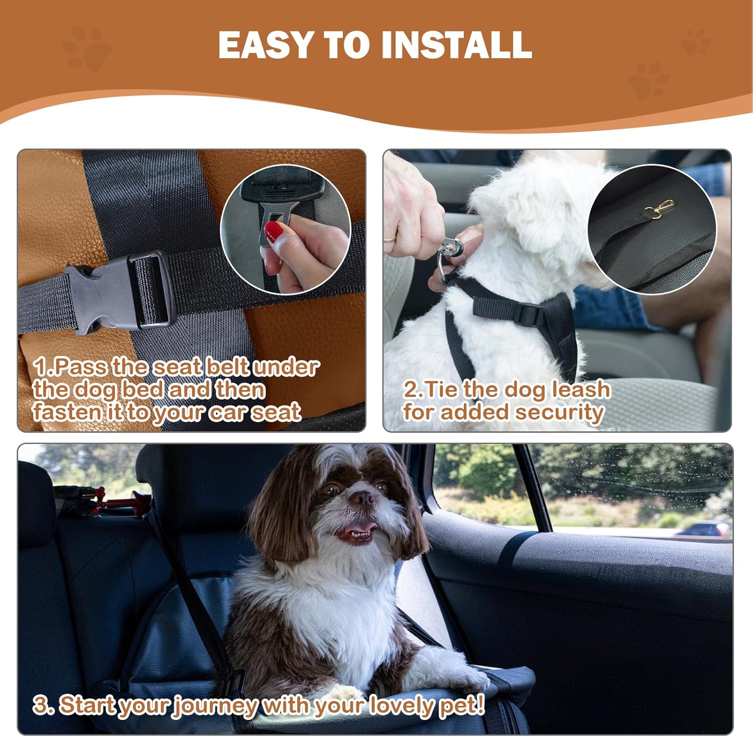 - [Premium Leather Dog Car Seat]: This dog car seat is made from high-quality leather, which is wear-resistant and scratch-resistant, and very durable. The interior is filled with pp foam to enhance cushioning. The adjustable lock on the back and the reserved seat belt position can firmly fix this pet car booster seat to the car seat, improving the safety of the dog during car driving.
