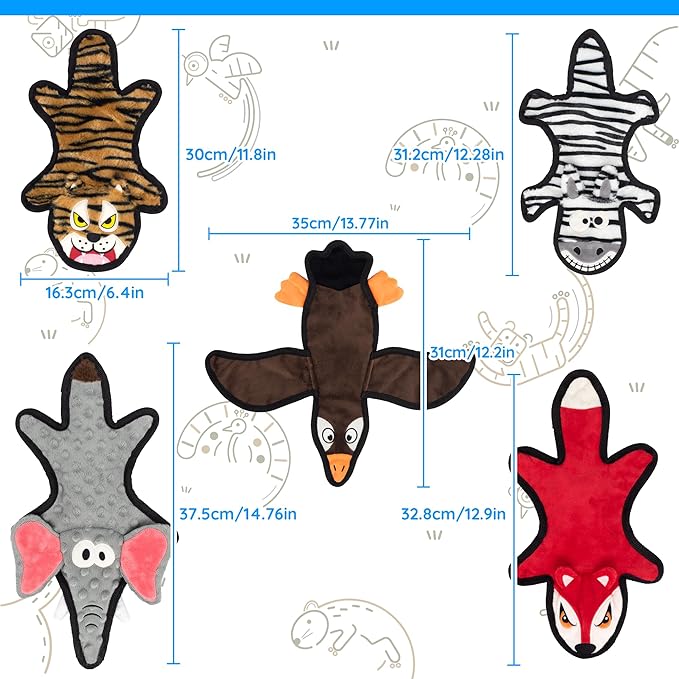 - Newly launched dog toys: The stuffing Free dog toys pack is what LECHONG newly launched animal series. This durable dog toys set include 5 most popular animals, wild geese, tiger, fox, zebra and elephant