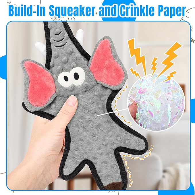 - Dog toys to keep them busy: 5 vivid animal shape dog toys are suit for both large medium and small breeds. Those large dog toys have inner squeaker and crinkle paper, It can attract the curiosity of dogs. The soft plush on the surface not only does no harm to the dog's teeth, but also helps the dog clean its teeth and maintain oral health