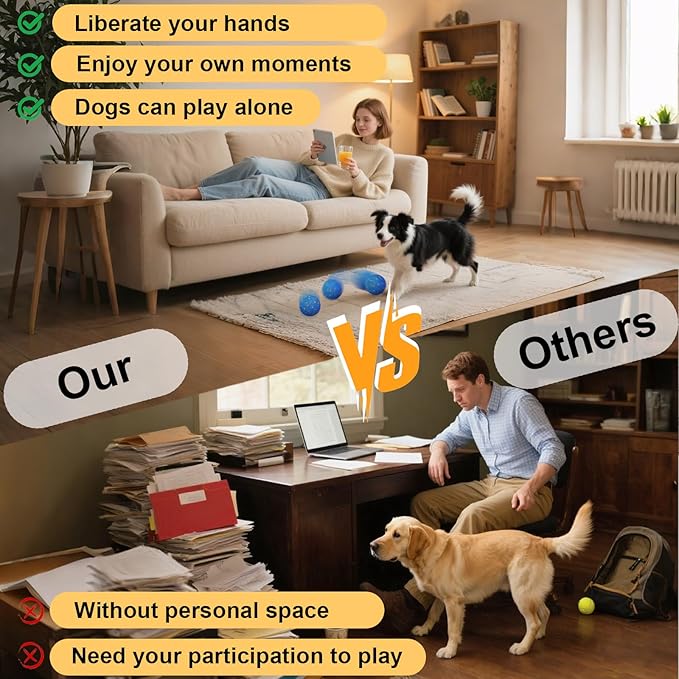 - 【Thrives Anywhere】From rainy-day indoor zoomies on hardwood floors to muddy backyard adventures, this self-bouncing ball adapts to all terrains! Its smart ground-sensing tech maintains exciting play (Hard floors work best), giving your pup exhilarating energy release while you work, cook, or relax. Come home to a happily tired dog!